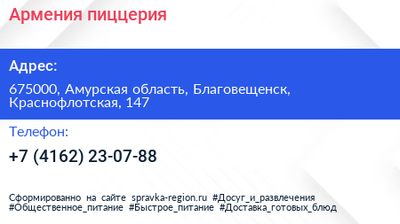 Армения, пиццерия по адресу 675000, Амурская область, Благовещенск, Краснофлотская, 147 в дальнейшем Организация, размещена в следующих категориях: