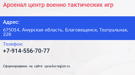 Арсенал, центр военно-тактических игр по адресу 675014, Амурская область, Благовещенск, Театральная, 228 в дальнейшем Организация, размещена в следующих категориях: