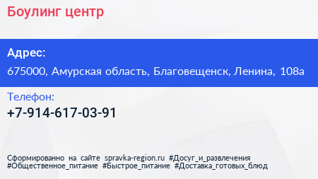 Боулинг-центр по адресу 675000, Амурская область, Благовещенск, Ленина, 108а в дальнейшем Организация, размещена в следующих категориях: