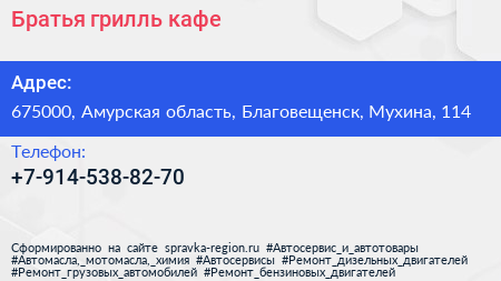 Братья грилль, кафе по адресу 675000, Амурская область, Благовещенск, Мухина, 114 в дальнейшем Организация, размещена в следующих категориях: