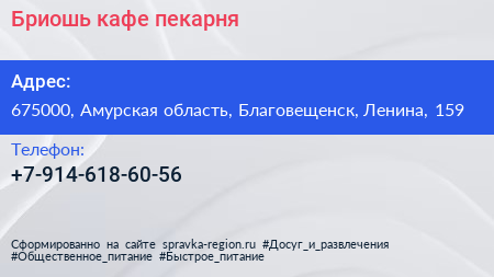 Бриошь, кафе-пекарня по адресу 675000, Амурская область, Благовещенск, Ленина, 159 в дальнейшем Организация, размещена в следующих категориях: