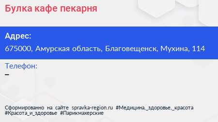 Булка, кафе-пекарня по адресу 675000, Амурская область, Благовещенск, Мухина, 114 в дальнейшем Организация, размещена в следующих категориях: