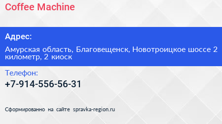 Coffee Machine по адресу Амурская область, Благовещенск, Новотроицкое шоссе 2 километр, 2 киоск в дальнейшем Организация, размещена в следующих категориях: