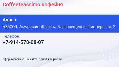 Coffeeteassimo, кофейня по адресу 675000, Амурская область, Благовещенск, Пионерская, 2 в дальнейшем Организация, размещена в следующих категориях:
