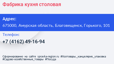 Фабрика-кухня, столовая по адресу 675000, Амурская область, Благовещенск, Горького, 101 в дальнейшем Организация, размещена в следующих категориях: