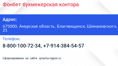 Фонбет, букмекерская контора по адресу 675000, Амурская область, Благовещенск, Шимановского, 21 в дальнейшем Организация, размещена в следующих категориях: