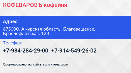 КОФЕВАРОВЪ, кофейня по адресу 675000, Амурская область, Благовещенск, Краснофлотская, 123 в дальнейшем Организация, размещена в следующих категориях: