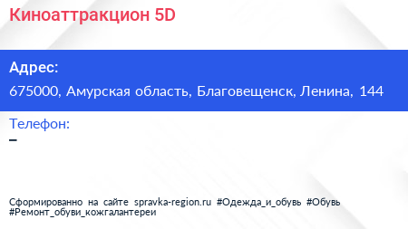 Киноаттракцион 5D по адресу 675000, Амурская область, Благовещенск, Ленина, 144 в дальнейшем Организация, размещена в следующих категориях: