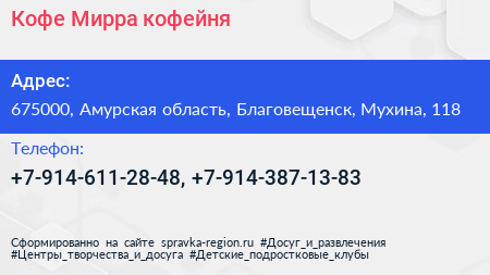Кофе Мирра, кофейня по адресу 675000, Амурская область, Благовещенск, Мухина, 118 в дальнейшем Организация, размещена в следующих категориях: