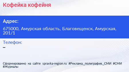 Кофейка, кофейня по адресу 675000, Амурская область, Благовещенск, Амурская, 201/1 в дальнейшем Организация, размещена в следующих категориях: