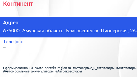 Континент по адресу 675000, Амурская область, Благовещенск, Пионерская, 26а в дальнейшем Организация, размещена в следующих категориях: