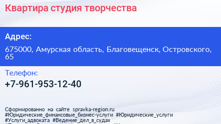 Квартира, студия творчества по адресу 675000, Амурская область, Благовещенск, Островского, 65 в дальнейшем Организация, размещена в следующих категориях: