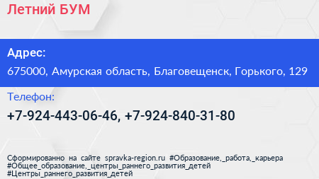 Летний БУМ по адресу 675000, Амурская область, Благовещенск, Горького, 129 в дальнейшем Организация, размещена в следующих категориях: