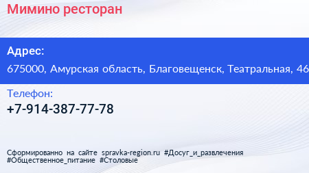 Мимино, ресторан по адресу 675000, Амурская область, Благовещенск, Театральная, 46 в дальнейшем Организация, размещена в следующих категориях: