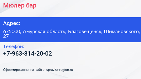 Мюлер, бар по адресу 675000, Амурская область, Благовещенск, Шимановского, 27 в дальнейшем Организация, размещена в следующих категориях: