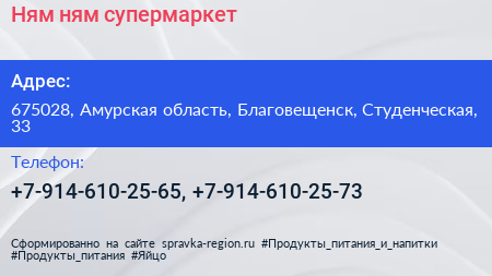 Ням-ням, супермаркет по адресу 675028, Амурская область, Благовещенск, Студенческая, 33 в дальнейшем Организация, размещена в следующих категориях: