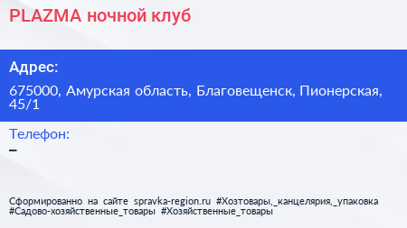 PLAZMA, ночной клуб по адресу 675000, Амурская область, Благовещенск, Пионерская, 45/1 в дальнейшем Организация, размещена в следующих категориях: