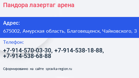Пандора, лазертаг-арена по адресу 675002, Амурская область, Благовещенск, Чайковского, 3 в дальнейшем Организация, размещена в следующих категориях: