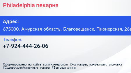Philadelphia, пекарня по адресу 675000, Амурская область, Благовещенск, Пионерская, 26а в дальнейшем Организация, размещена в следующих категориях: