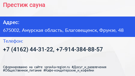 Престиж, сауна по адресу 675002, Амурская область, Благовещенск, Фрунзе, 48 в дальнейшем Организация, размещена в следующих категориях: