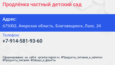 Продлёнка, частный детский сад по адресу 675002, Амурская область, Благовещенск, Лазо, 24 в дальнейшем Организация, размещена в следующих категориях: