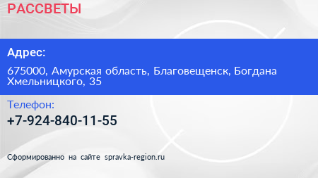 РАССВЕТЫ по адресу 675000, Амурская область, Благовещенск, Богдана Хмельницкого, 35 в дальнейшем Организация, размещена в следующих категориях: