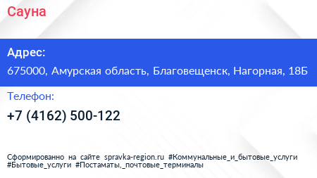 Сауна по адресу 675000, Амурская область, Благовещенск, Нагорная, 18Б в дальнейшем Организация, размещена в следующих категориях:
