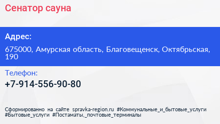 Сенатор, сауна по адресу 675000, Амурская область, Благовещенск, Октябрьская, 190 в дальнейшем Организация, размещена в следующих категориях: