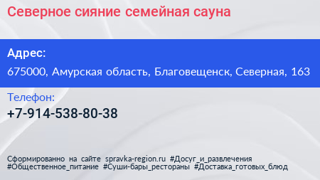 Северное сияние, семейная сауна по адресу 675000, Амурская область, Благовещенск, Северная, 163 в дальнейшем Организация, размещена в следующих категориях: