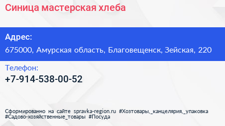 Синица, мастерская хлеба по адресу 675000, Амурская область, Благовещенск, Зейская, 220 в дальнейшем Организация, размещена в следующих категориях: