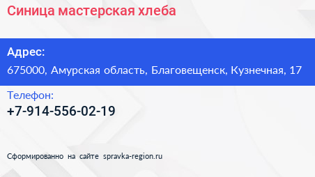 Синица, мастерская хлеба по адресу 675000, Амурская область, Благовещенск, Кузнечная, 17 в дальнейшем Организация, размещена в следующих категориях: