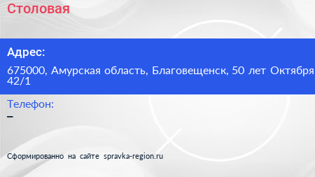 Столовая по адресу 675000, Амурская область, Благовещенск, 50 лет Октября, 42/1 в дальнейшем Организация, размещена в следующих категориях: