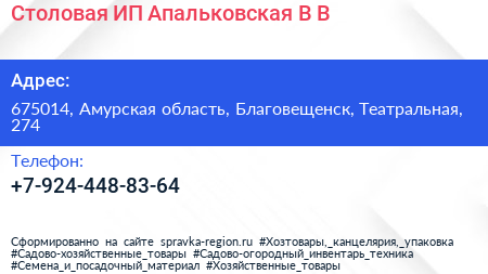 Столовая, ИП Апальковская В.В. по адресу 675014, Амурская область, Благовещенск, Театральная, 274 в дальнейшем Организация, размещена в следующих категориях: