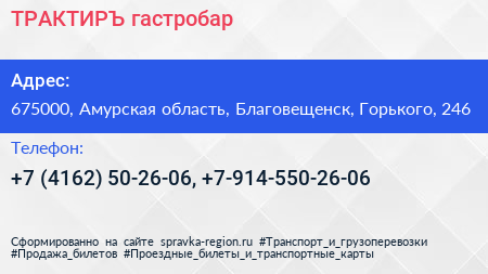 ТРАКТИРЪ, гастробар по адресу 675000, Амурская область, Благовещенск, Горького, 246 в дальнейшем Организация, размещена в следующих категориях:
