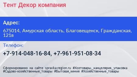 Тент-Декор, компания по адресу 675014, Амурская область, Благовещенск, Гражданская, 121в в дальнейшем Организация, размещена в следующих категориях: