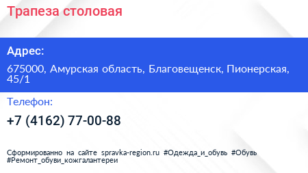 Трапеза, столовая по адресу 675000, Амурская область, Благовещенск, Пионерская, 45/1 в дальнейшем Организация, размещена в следующих категориях: