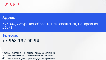 Циндао по адресу 675000, Амурская область, Благовещенск, Батарейная, 26а/1 в дальнейшем Организация, размещена в следующих категориях:
