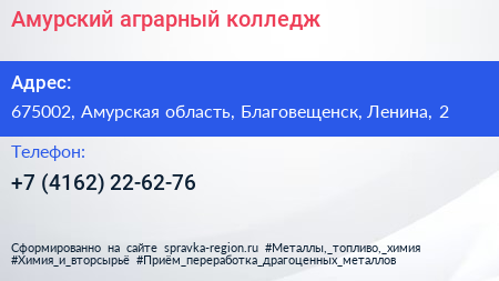 Амурский аграрный колледж по адресу 675002, Амурская область, Благовещенск, Ленина, 2 в дальнейшем Организация, размещена в следующих категориях: