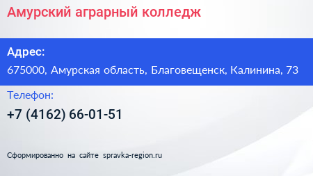 Амурский аграрный колледж по адресу 675000, Амурская область, Благовещенск, Калинина, 73 в дальнейшем Организация, размещена в следующих категориях: