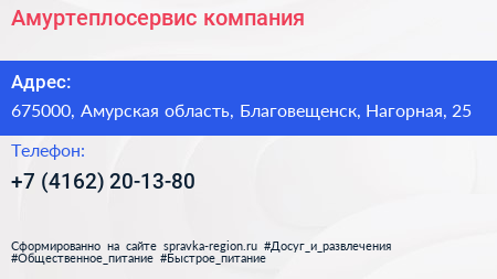 Амуртеплосервис, компания по адресу 675000, Амурская область, Благовещенск, Нагорная, 25 в дальнейшем Организация, размещена в следующих категориях: