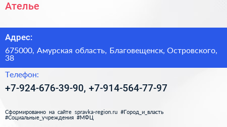 Ателье по адресу 675000, Амурская область, Благовещенск, Островского, 38 в дальнейшем Организация, размещена в следующих категориях:
