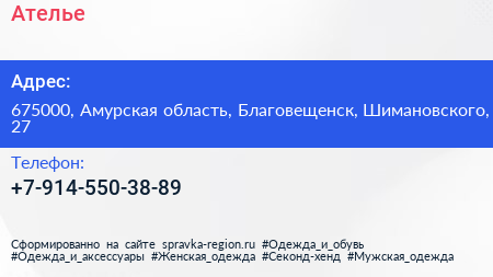Ателье по адресу 675000, Амурская область, Благовещенск, Шимановского, 27 в дальнейшем Организация, размещена в следующих категориях:
