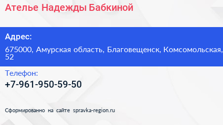 Ателье Надежды Бабкиной по адресу 675000, Амурская область, Благовещенск, Комсомольская, 52 в дальнейшем Организация, размещена в следующих категориях: