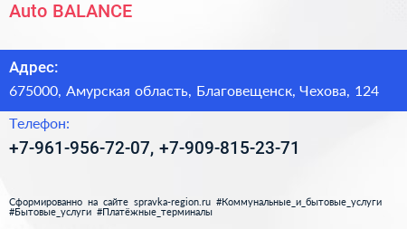 Auto-BALANCE по адресу 675000, Амурская область, Благовещенск, Чехова, 124 в дальнейшем Организация, размещена в следующих категориях: