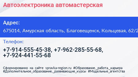 Автоэлектроника, автомастерская по адресу 675014, Амурская область, Благовещенск, Кольцевая, 62/2 в дальнейшем Организация, размещена в следующих категориях:
