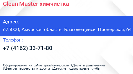 Clean Master, химчистка по адресу 675000, Амурская область, Благовещенск, Пионерская, 64 в дальнейшем Организация, размещена в следующих категориях: