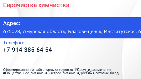 Еврочистка, химчистка по адресу 675028, Амурская область, Благовещенск, Институтская, 6 в дальнейшем Организация, размещена в следующих категориях: