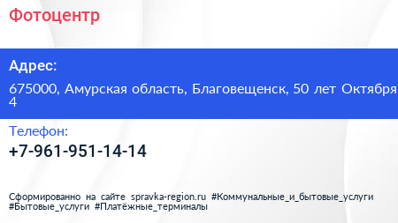 Фотоцентр по адресу 675000, Амурская область, Благовещенск, 50 лет Октября, 4 в дальнейшем Организация, размещена в следующих категориях: