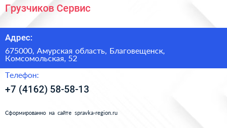 Грузчиков Сервис по адресу 675000, Амурская область, Благовещенск, Комсомольская, 52 в дальнейшем Организация, размещена в следующих категориях: