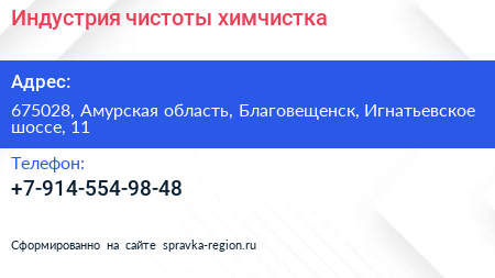 Индустрия чистоты, химчистка по адресу 675028, Амурская область, Благовещенск, Игнатьевское шоссе, 11 в дальнейшем Организация, размещена в следующих категориях: